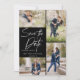 Toma tus 5 mejores imágenes de tu sesión de fotos de compromiso con 4 para el frente y una para el reverso. Presenta un diseño con letras a mano que dice Guardar la fecha.