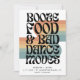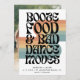 Bodas divertidas salvan las tarjetas de cita en una fuente inspirada en los años 70 que dice - Booze, comida y movimientos de baile malo. Añade los detalles de su boda al frente y la foto al fondo.