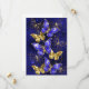 Composición de lujosas mariposas de zafiro y joyas de oro sobre fondo de textura azul.
