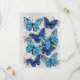 Composición vertical de mariposas morfo realistas, azules y blancas sobre fondo texturado gris. Mariposa morfo azul.