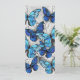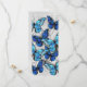 Composición vertical de mariposas morfo realistas, azules y blancas sobre fondo texturado gris. Mariposa morfo azul.