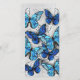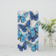 Composición vertical de mariposas morfo realistas, azules y blancas sobre fondo texturado gris. Mariposa morfo azul.