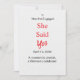 Celebre su momento especial con esta elegante y emotiva tarjeta de anuncio de compromiso. Con la frase audaz “Ella dijo que sí” en tipografía roja elegante sobre un fondo blanco limpio, este diseño es perfecto para compartir su feliz noticia con sus seres queridos.