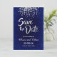 Una moderna tarjeta "Save the Date" con un toque de purpurina plateado en un fondo azul real profundo. Puede cambiar el estilo de letra y la ubicación de la forma que desee haciendo clic en el vínculo personalizar. Forma parte de una elegante suite nupcial totalmente personalizada.