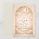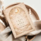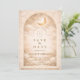 Un diseño celeste luminoso que presenta delicadas lunas crecientes y estrellas de constelaciones dispersas sobre un cálido fondo de pergamino. Un refinado borde dorado enmarca la composición, mientras que la tipografía de letra cursiva elegante crea un punto focal grácil digno de un hito tan significativo. Los tonos suaves marfil y champán dan a toda la pieza un brillo radiante y atemporal. Perfecto para una celebración de quinceañera que se siente romántica, elevada y tocada por la luz de las estrellas.