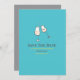 Una tarjeta plana minimalista y sencilla de "reservar la fecha" tiene una ilustración dibujada a mano de dos copas de champán inclinadas entre sí en color melocotón pastel bordeado con gris oscuro. Están colocadas sobre un fondo azul aqua y tienen plantillas para tu texto personalizado en gris y amarillo iluminado debajo de ellas. El fondo gris oscuro en la parte posterior tiene una plantilla para información adicional, si se requiere. Estas son ideales para anuncios de parejas heterosexuales y del colectivo LGBT.