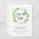 Esta elegante tarjeta de save the date botánica presenta una corona verde de hojas, sobre un fondo blanco limpio. Hemos utilizado arte de LABFcreations.