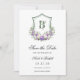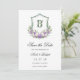 Esta hermosa tarjeta de aviso de boda con cresta floral morada y blanca con las iniciales de la novia y el novio sería perfecta para su boda. Su redacción es tradicional pero moderna y las fuentes son exquisitas. Las rosas de color púrpura y blanco pintadas a la acuarela, peonías y lirios del valle y el verde desgreñado son impresionantes juntos.