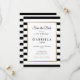 Con un fondo clásico de rayas blancas y negras, este elegante cumpleaños de cualquier edad, salvo la tarjeta de fecha, presenta un elegante borde de Relieve metalizado de oro falso encuadrando los detalles de fecha establecidos en la tipografía de moda. Diseñado por Thisisnotme©