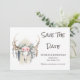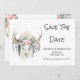 Una ilustración de un cráneo de ciervo colocado sobre un fondo de salpicadura de acuarela beige está infundido con plumas de pájaros silvestres, hojas; cristales y borlas. Hermosas rosas florales rosadas; flores de anémona y follaje descansan sobre su frente y plantillas de texto marrón atrevido aparecen a la derecha del mismo para tu texto personalizado. Las esquinas superiores traseras tienen plumas tribales y atrapasueños colgando de ellas adornados con ramos de follaje de rosa. Ideal para bodas tribales; country western; rústicas; al aire libre; boho | bohemian; bosque y forestales.