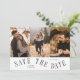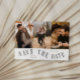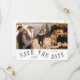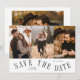 Elegant and modern card featuring a text on a curved path that says "save the date." 3 photos on the front and one on the back. The background is white.