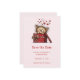 Save the date card with a cute drawing of a little kitten poking its head out of a gift box.