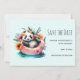 Guarda la tarjeta de fecha con una adorable imagen de verano. Un diseño acuático con un panda blanco y negro sentado en una junta de natación en el agua. Rodeado de flores silvestres de bonito. Un oso totalmente frío.