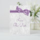 Tarjetas planas de "Save the Date" para boda elegante. Hermoso fondo con patrón de damasco blanco y una imagen de lazo y cinta de color púrpura / lila / lavanda, bonita y elegante. Estos "Save the Date" glamurosos, chic y clásicos son de una gran sofisticación y están decorados / impresos en ambos lados. Tengo invitaciones de boda y otros productos coincidentes en mi tienda. POR FAVOR TENGA EN CUENTA: Todas las invitaciones en Zazzle tienen imágenes impresas planas. Imágenes de lazos y cintas compradas a digital-designs-by-elena. Si necesita ayuda para personalizar su producto, por favor contácteme a través de mi tienda y estaré encantado de ayudar.