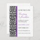Un diseño de papel pintado blanco y negro de damasco junto con acentos reales morados sirven para resaltar esta invitación. Fácilmente personalizado con su(s) nombre(s), fecha de evento e información. La espalda se deja en blanco intencionalmente. Disponible en colores alternativos con favores, postales e invitaciones coincidentes