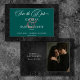 Sumérjase en un mundo de oscura elegancia con nuestra cautivadora boda gótica salve la tarjeta de cita con su foto favorita. Enfrente de un impresionante tapiz floral vintage de satén negro sobre negro, esta invitación desprende un aire de misterio y encanto intemporal. El fondo del cuadro de texto en verde verde azulado enriquecido añade un toque de color. Con fuentes vintage y un estilo antiguo que exuda sofisticación, esta invitación es una combinación perfecta de encanto antiguo y encanto contemporáneo. Aprovecha el encanto del pasado e invita a tus invitados a presenciar un amor que trasciende el tiempo con esta cautivadora invitación gótica a la boda. Creado por Simply Farmhouse Press.