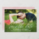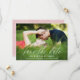 Elegante foto guardar la tarjeta de fecha con un delicado guión de caligrafía. Añade tus nombres, fecha de boda y otra información, así como una foto de los dos. La parte posterior presenta un patrón de hojas en color rojo y blanco.