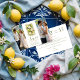 This design combines botanical delicacy with a delicate arrangement of flowers and lemons, creating a fresh, sophisticated, and luminous style. The natural color palette, with soft greens and citrusy yellows, provides harmony and vitality, while the floral composition conveys romance and a timeless character. On the front, the design features a prominent space for two photographs, allowing both personal images to integrate seamlessly into the composition and enhance the emotional value of the Save the Date at first glance.