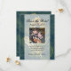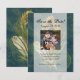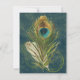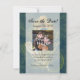 ¡Guarde la fecha con foto! Celebre su boda con un tema de pavo real artístico y único con esta hermosa invitación de boda y conjunto de accesorios a juego. Cuenta con arte elegante, rico y lujoso de un detalle de pluma de pavo real en colores de azul cobalto, azul verdoso y verde celadón claro. Fondo en azul aqua oscuro con un lavado antiguo y diseño en espiral. © 2010 www.CustomInvitesOnline.com