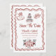 este caprichoso diseño de salvar la fecha de la boda con tema italiano presenta, garabatos y dibujos de estilo a mano alzada en rojo. Un borde de línea ondulada enmarca la invitación romántica inspirada en Italia. Un tema perfecto para la pareja que se dirige a una luna de miel italiana romántica después de la boda. Este diseño de salvar la fecha está disponible solo para imprimir.
