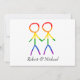 Esta tarjeta de anuncio de boda presenta un diseño hermoso y simple para anunciar su próxima boda. El gráfico representa a dos hombres, en forma de figuras de palos elegantes, tomados de la mano. Las figuras están coloreadas en un hermoso arcoíris, simbolizando el amor y la diversidad. Esta tarjeta es una forma maravillosa de dar un toque cohesivo y significativo a su papelería, al tiempo que proporciona a los invitados una forma clara y elegante de marcar sus calendarios.