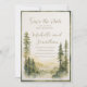 Boda cristiana Guardar la tarjeta de fecha con escritura de cita inspiradora representa un hermoso diseño de acuarela de naturaleza simple enmarcado que incluye pinos forestales y montañas en tonos tierra de sabios, verde oscuro y bronceado. Presenta la introducción de la Biblia Verse, "Y los dos se convertirán en uno".