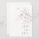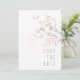 Delicados arreglos folclóricos con pequeños acentos florales en tonos suaves y oníricos de crema, taupe y rosa con salpicaduras de purpurina burdeos y diseños únicos hacen de este una interesante colección, especialmente para bodas de otoño. La tarjeta Save the Date de boda que se muestra aquí incluye un marco circular de efecto Relieve metalizado bordeado por follaje en la cara frontal y una disposición suave y descolorida de color de agua en la parte posterior. Vea el vínculo de colección en esta página para ver todos los elementos coincidentes de este hermoso diseño o busque ID817 para ver otras piezas y opciones de color para este conjunto.