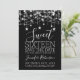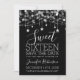 Silver & Black Sweet 16 Birthday Sparkly String Lights "Save the Date" plantilla de invitación con dirección fiesta y detalles RSVP.