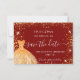 Una chica y de moda Salva la tarjeta de fecha para una dulce fiesta de 16 años. Un elegante fondo rojo decorado con chispas purpurinas doradas y un vestido. Personalice y agregue una fecha y un nombre/edad. El texto: Save the Date se escribe con un gran guión de estilo escrito a mano.