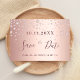 Una tarjeta femenina y glamorosa salva la fecha para una dulce fiesta de 16, 16 años. Un fondo de color rosa rosa y rosa de imitación de color metálico adornado con una falsa rociada de diamante de oro rosa. Plantillas para una fecha y su texto. Letras de color oro rosa oscuro. El texto: Save the Date se escribe con un gran guión de estilo escrito a mano.