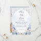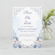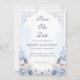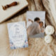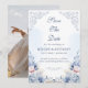 This elegant save the date design pairs soft dusty blue watercolor flowers with a favorite engagement photo for a romantic and timeless wedding announcement. Delicate blush accents and French-inspired scrollwork create a refined look that suits classic, formal, and garden wedding styles beautifully. The photo layout adds a personal touch while the floral frame keeps the overall design polished and graceful. It is a lovely choice for couples who want coordinated blue wedding stationery with a soft, airy feel.