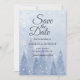 Un "salve la fecha" con una escena de invierno soñadora de pinos que se desvanecen y copos de nieve en hermosos tonos de azul polvoriento. Mesmerice a sus invitados con este magnífico paisaje nevado. También está disponible la invitación de matrimonio coincidente y otras necesidades básicas de los bodas.