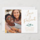 Esta sencilla pero elegante tarjeta plana de postergación para bodas de fotos presenta una plantilla de diseño moderna con tu foto a la izquierda y a la derecha se lee en un falso guión de oro "El amor es paciente" con tus nombres y mensajes para personalizar. La parte posterior de la tarjeta contiene más detalles de su nueva fecha de boda. ¡Mis mejores deseos para su compromiso y boda! Diseñado por Susan Coffey.