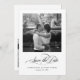 Estas elegantes bodas en blanco y negro, que ahorran las tarjetas de cita, presentan un estilo clásico del viejo mundo con caligrafía romántica y dos de sus fotos bodas favoritas. Hay un escaneado código QR en la parte posterior para que los huéspedes puedan visitar su sitio web boda para más detalles o para rsvp. Fije el tono para su boda de inspiración sofisticada e inminente, con este elegante diseño minimalista.