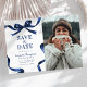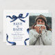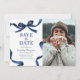 Announce your upcoming graduation in timeless style with this elegant Save the Date announcement. Featuring a photo of the graduate on a clean white background, framed by a stylish blue watercolor bow and ribbon border, this design perfectly blends classic sophistication with modern charm.