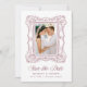 Announce your wedding with this elegant burgundy ornate frame photo save the date, featuring a hand-drawn antique picture frame that brings depth and warmth to the design. The front highlights the couple’s vertical engagement photo, with graceful calligraphy and refined serif lettering creating a balanced, formal layout. The back includes a horizontal engagement photo, along with custom text and a scannable QR code for sharing your wedding website with guests. This personalized photo save the date offers a romantic yet modern approach to announcing your wedding.