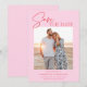 A modern pink and red save the date photo announcement featuring a calligraphy script font and simple minimalist design. This unique save the date card is a trendy way to announce your wedding. THE SAMPLE PHOTO IS NOT INCLUDED. REPLACE WITH YOUR OWN PHOTO BEFORE ORDERING.