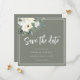 This rustic elegant 'Save the Date' card features a neutral watercolor floral design with green leaves. Olive green background with a classic off white border.