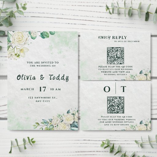Featuring soft green watercolor washes and delicate white florals, this card coordinates seamlessly with the Organic Modern Wedding Invitation and full suite.