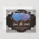 Romantic rustic purple and blue floral wedding save the date card featuring hydrangea hearts against a barn wood background adorned with white floral lace and string lights. Two burlap hearts and delicate floral lace on a rustic wood background at the back.