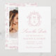 Introduce your wedding date with soft sophistication using this rose pink monogram save the date card. The front design centers on your monogram initials surrounded by an elaborate crest of chinoiserie and baroque motifs, offering a romantic, heirloom-inspired look. Flowing calligraphy displays “Save the Date,” with your wedding details presented below in timeless serif lettering. The back features your vertical engagement photo framed in white, with space beneath for your wedding website and QR code. A rose pink and white chinoiserie floral pattern with Victorian-inspired detailing completes the design, creating a graceful and polished announcement for your celebration.
