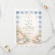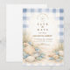 A refined coastal wedding design featuring an elegant oval wreath of seashells, oyster shells, starfish, and soft sea glass accents. Neutral sandy tones blend with muted ocean blues and delicate dune grasses to create a serene seaside aesthetic. The warm parchment background enhances the natural textures while maintaining a timeless, elevated feel. Perfect for a romantic beach celebration with classic coastal charm.
