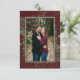 Introducing our enchanting winter wedding photo save the date card, where timeless elegance meets the beauty of the season. The rich burgundy background, softly distressed with white accents, sets a captivating tone for your special day. In the dark sage green text area, your wedding details stand out, surrounded by a delicate cream frame that adds a touch of refinement. Embrace the spirit of winter with a breathtaking frame of lush greenery, featuring holly adorned with rich red berries, mistletoe with its delicate white berries, and the timeless allure of green pine. Created by Simply Farmhouse Press.