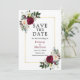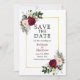 Moderno y elegante acuarela Borgoña Invitación Boda de Compromiso Floral Save The Date Card incluye peonías, lirios, hojas de eucalipto y otros hermosos paisajes sobre un marco dorado.