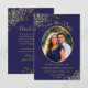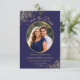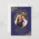 Estas hermosas tarjetas son una excelente manera de hacer saber a sus amigos y familia que deben guardar la fecha para su próximo boda. Tienen un diseño azul marino y dorado con tu foto en un marco ovalado rodeado de adornos de encajes de Relieve metalizado dorados y elegantes letras de guiones con tus nombres, fecha boda y ubicación. La parte de atrás tiene un lindo gráfico de "lápiz en" con espacio para una nota que puede incluir un sitio web donde sus invitados pueden ir para más información.