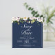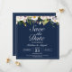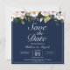 Una boda elegante salva la fecha con flores blancas y un fondo azul marino. Personalízalo con un código QR en la parte posterior que sus huéspedes pueden escanear para abrir fácilmente su sitio web boda.