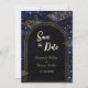 Anuncie su día especial con esta elegante y mística tarjeta Save the Date. Con un rico fondo negro adornado con brillantes estrellas de oro y constelaciones, este diseño irradia un sentido de romance cósmico y elegancia eterna. El diseño refinado y los detalles celestes crean un ambiente de ensueño, perfecto para las almas espectaculares y las noches encantadas. Una manera cautivadora de marcar el comienzo de tu historia de amor escrita en las estrellas.