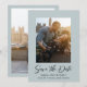 Elegante boda ahorra la tarjeta de fecha con un diseño simple y mínimo con "Save the Date" en una tipografía moderna junto con los detalles de tu evento debajo de tu foto vertical favorita. La parte posterior tiene una segunda imagen junto con una línea opcional de texto sobre la parte inferior de la imagen. El tema de color es niebla (gris azul) y puede cambiarse en la herramienta de edición de diseño. Este diseño es genial, ya sea que tengas un boda formal o informal.