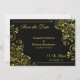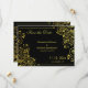 Un diseño fabuloso y ornamentado con espirales dorados y pequeñas flores. Sobre un fondo negro, esta es una elegante tarjeta de "guarda la fecha" para tu próxima boda. El texto desplazado copia las líneas de los florituras y espirales en el patrón decorativo. Si has decidido que el negro y el dorado sean tus colores principales para la boda, esta es una excelente opción.