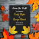 Esta elegante boda de otoño, salvo la invitación de fecha, es perfecta para un boda moderno de otoño. El diseño es sencillo, con hojas de arce en cascada doradas y una tipografía blanca y dorada elegante sobre un fondo negro.
